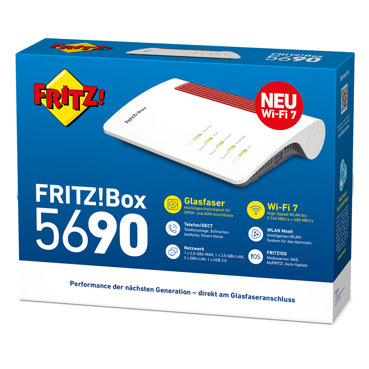 Die FRITZ!Box 5690 ist das neue Highend-Modell für den direkten Einsatz am Glasfaseranschluss. Mit innovativem Wi-Fi 7 erreicht sie Datenraten von bis zu 5760 MBit/s – ideal für anspruchsvolle Breitbandanwendungen. Ein 2,5-Gigabit-WAN-Anschluss, ein 2,5-Gigabit-LAN-Anschluss und zwei weitere Gigabit-LAN-Anschlüsse bieten größtmögliche Anschlussoptionen. Zusätzlich punktet die FRITZ!Box 5690 mit komfortabler Telefonie, intelligenten Sicherheitsfunktionen und umfangreichen Smart-Home-Funktionen via DECT ULE sowie einem leistungsstarken FRITZ!OS. Direkt anschließen, einfach einrichten Die FRITZ!Box 5690 wird direkt mit dem Glasfaserkabel am Anschluss verbunden – ganz ohne separates Modem. Sie unterstützt die in Europa gängigen Standards GPON und AON und lässt sich in wenigen Schritten komfortabel über die Benutzeroberfläche einrichten. Zudem lässt sich die FRITZ!Box auch flexibel an ein Glasfasermodem (ONT) anschließen.
