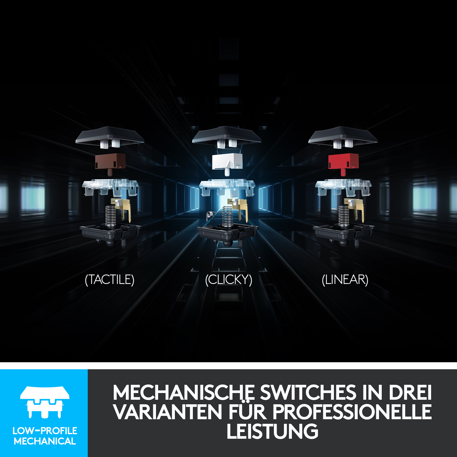 G915 ist unsere erste Tastatur mit neuen hochleistungsfähigen flachen mechanischen GL-Switches, die nur halb so hoch sind wie herkömmliche Switches, aber dieselbe Geschwindigkeit, Präzision und Leistung bieten. Wir haben unsere GL-Switches rigoros mit strengen Anforderungen an Haltbarkeit, Reaktionsfähigkeit und Präzision getestet. Erhältlich in drei Varianten: