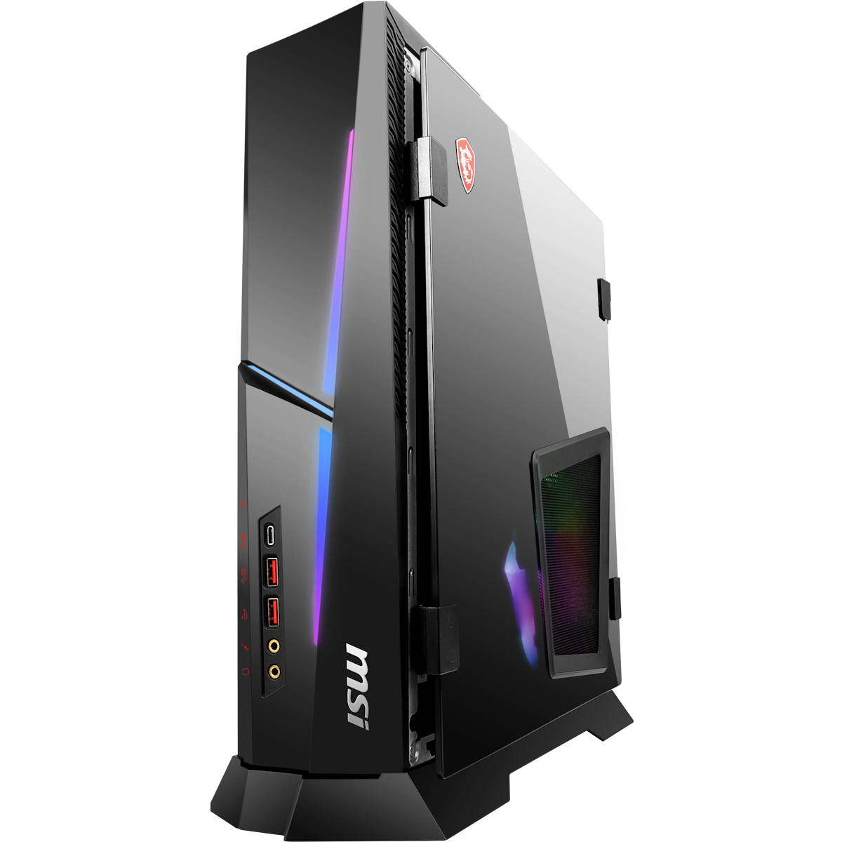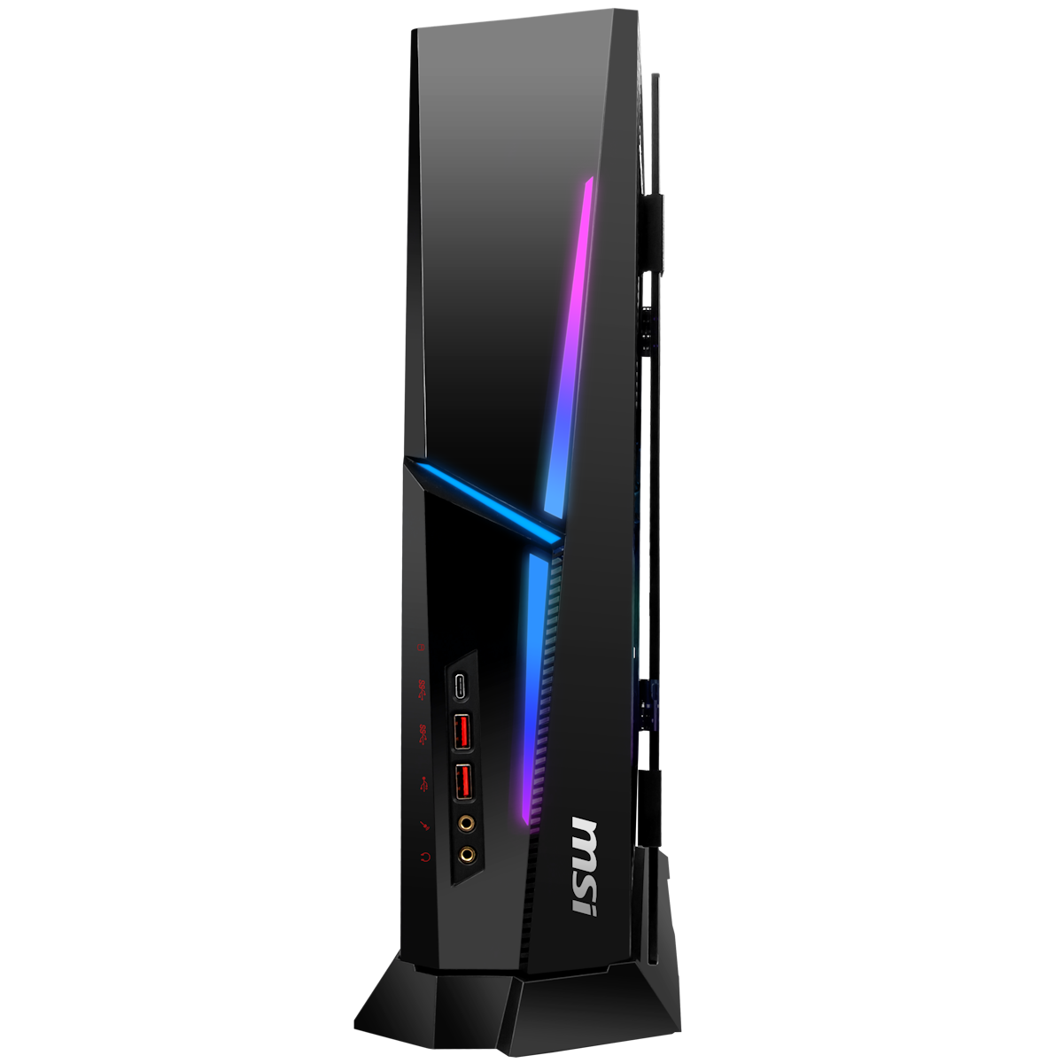 Das System hat für jede Komponente eigene Luftkammern und nutzt clevere Algorithmen, um die Lüftergeschwindigkeit optimal zu regeln. So wird die Wärme effizient aus dem Gaming-Desktop abgeleitet und du kannst dich auf kompromisslose Leistung verlassen. WENIGER IST MEHRDie Trident-Serie ist der kompakteste Gaming-Desktop auf dem Markt. Trotz seines Volumens von nur 10 Litern hat er leistungsstarke Komponenten, die man sonst nur in Full-Tower-Gehäusen findet, wie die neuesten Prozessoren und Grafikkarten. Kurz gesagt: Das Einzige, was die Trident-Serie übertreffen kann, ist ihre nächste Evolutionsstufe. Einzigartig in Aussehen und FunktionalitätMPG Trident AS ist einzigartig mit seiner türartigen Seitenwand mit gehärtetem Glas. Sobald Kunden die native Metallseitenwand gegen die gehärtete Glasscheibe ausgetauscht haben, können sie die Glasscheibe leicht wie eine Tür öffnen, wodurch sie die CPU, die Speicher oder die Festplatte problemlos aufrüsten können. BELEUCHTE DEIN SYSTEMDer MPG Trident AS AI hat eine anpassbare RGB-Beleuchtung, die echt cool ist. Von dem durch das gehärtete Glas sichtbaren pulsierenden Innenleben bis hin zu den externen Akzenten verbessert die Beleuchtung dein Gaming-Erlebnis. Mit der Ambient Link-Technik synchronisieren sich die Lichter mit dem Geschehen auf dem Bildschirm und schaffen so eine immersive Atmosphäre, die sowohl den Stil als auch das Gameplay aufwertet.