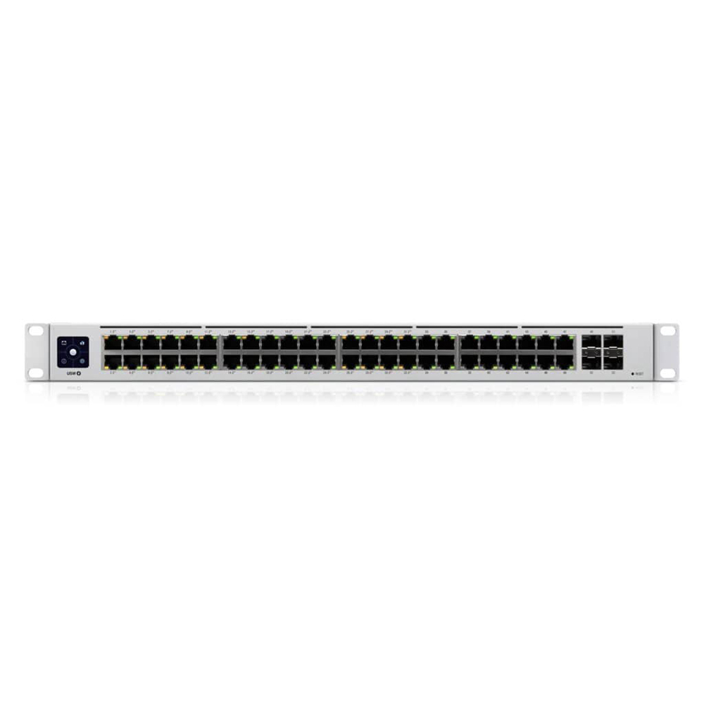 Der USW-48-PoE ist ein konfigurierbarer Gigabit-Layer-2-Switch mit 48 Gigabit-Ethernet-Ports, einschließlich 32 802.3at PoE+ Ports mit automatischer Erkennung und 4 SFP Ports. Er bietet Gigabit PoE-Verbindungen zu deinen RJ45-Ethernet-Geräten und Gigabit-Glasfaser-Uplink-Optionen zu deinem Unternehmensnetzwerk. Der USW-48-PoE verfügt über ein 1,3-Zoll-Touch-LCM, um den Status anzuzeigen